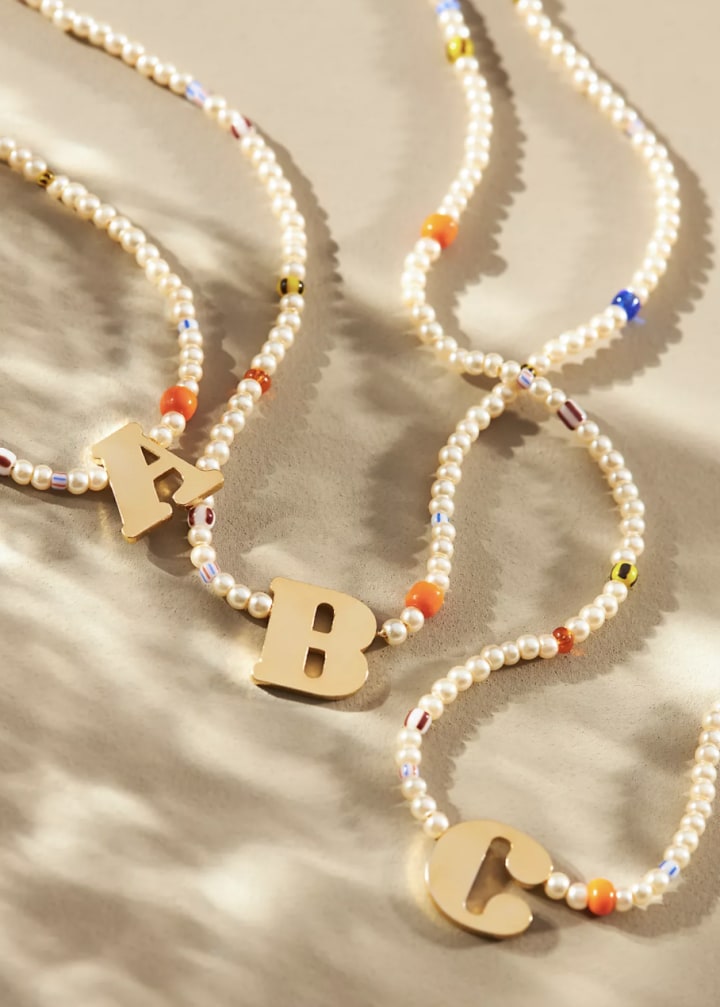 Brand a statement with this bold monogram pendant. It features a gold-plated letter set among mother-of-pearl and glass beads. "I wear this necklace every day to swim, conditioning and shower and it hasn't faded at all — I am totally in love with it," wrote ane reviewer.